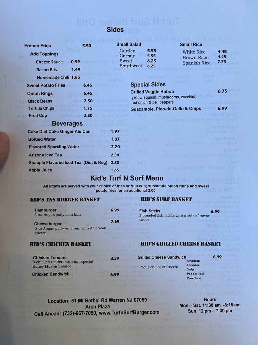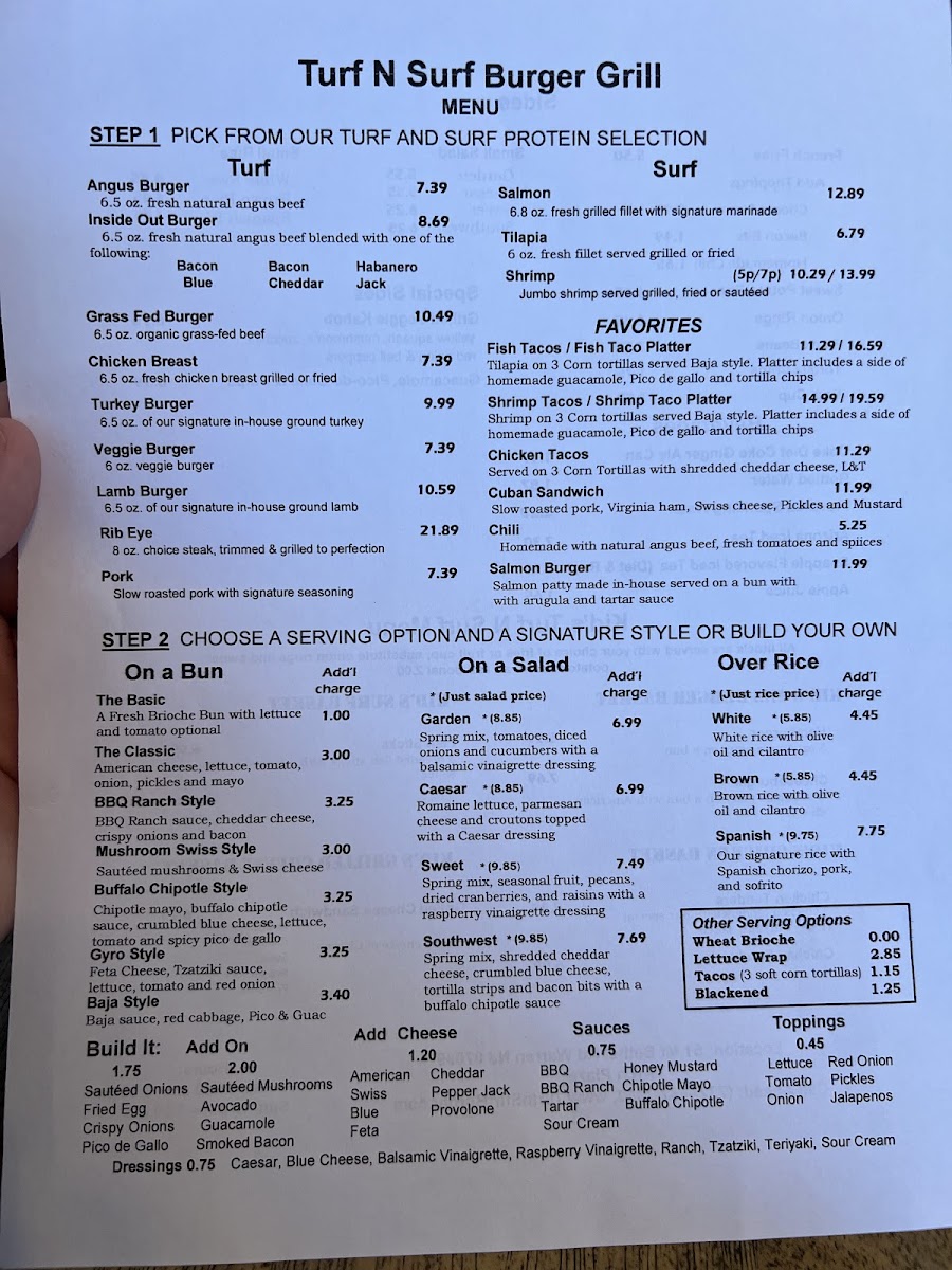 Turf N Surf Burger Grill offers a diverse menu with something for everyone, blending fresh ingredients and bold flavors. For drinks, options include classic sodas like Coca-Cola and Sprite (can), as well as refreshing beverages such as Arizona Iced Tea and Flavored Sparkling Water. The "Surf" section features delicious seafood options like Salmon and Shrimp (7 pieces), with a choice of Tilapia or a Salmon Burger for those craving a burger twist. If you're in the mood for something lighter, the "No Protein" option offers a simple yet satisfying choice. For sides, try the savory Chicken Tortilla Soup or the crispy Tortilla Chips W/ Guac & Pico. The grilled options are equally appetizing, including the Grilled Veggie Kabob and flavorful Black Beans. There’s also a range of salads, including the zesty Southwest Salad and the classic Caesar Salad. Tacos are a standout here with choices like Fish Taco Platter, Pork Tacos, and Shrimp Taco Platter, perfect for anyone craving a burst of flavor. The "Turf" section features hearty options such as the juicy Grass Fed Burger and the unique Inside Out Burger, alongside a tender Rib-Eye and savory Pork dishes. There are also delicious options for vegetarians, like the tasty Veggie Burger. Kids can enjoy simpler meals from the Kid's Turf N Surf Menu, which includes favorites like Chicken Tenders, Fish Sticks, and a classic Cheeseburger or Grilled Cheese Sandwich. The menu at Turf N Surf Burger Grill strikes a perfect balance between comfort food and fresh, vibrant dishes, making it an excellent choice for any occasion.